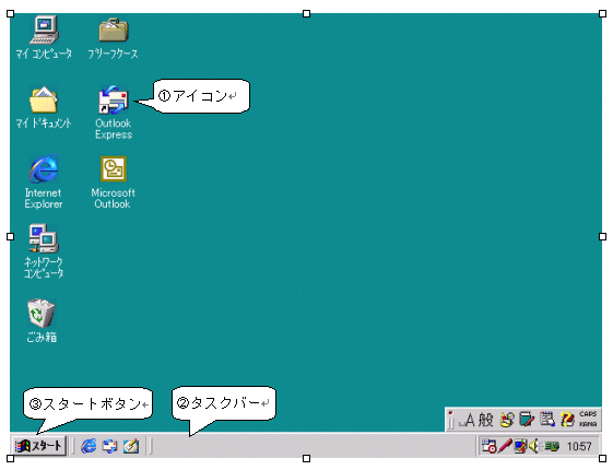 ●デスクトップ…Windowsを起動し、最初に表示される画面 をデスクトップと呼びます。デスクトップは、机の上という名前の通り、机のイメージを、そのままパソコンの操作に活かすように作られています。