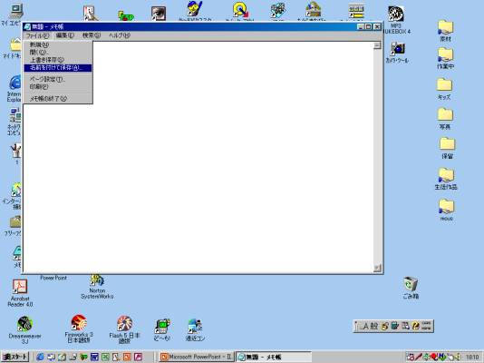 ●初めて書類を保存するときは、元のファイルが存在しないため、”上書き保存” コマンドも”名前を付けて保存”コマンドと同様に保存名と保存先の指定を行うことができます。 ●一度保存している書類を編集しているときに、”上書き保存”コマンドを選択した場合は、現在の内容に更新します。”名前を付けて保存”コマンドを選択した場合は、最後に保存した状態の書類を残し、現在の内容を新しい書類として保存します。