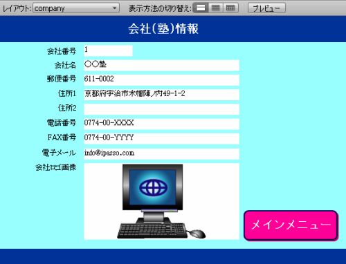 メインメニュー→[会社情報]([classroomMS]フォルダの[company.fp7])を開いていただくと上図の画面が出てきます。メインメニューの[会社情報]のボタンをクリックしても[会社情報]のファイルを開けます。会社情報を入力するファイルです。