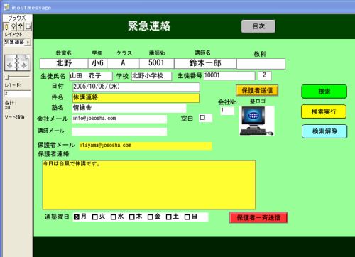@緊急連絡があるときは、黄色の件名と保護者連絡欄に連絡事項を記入して、黄色の保護者ボタンを押すと、現在表示されている生徒の保護者にメールを送信することができます。 A特定レコードの検索:検索ボタンをクリックして検索モードにし、検索条件を入力して、検索実行ボタンをクリックしてください。 A通塾曜日で検索して、赤い保護者一斉送信のボタンをクリックすると検索した保護者に一斉にメールを送信することができます。