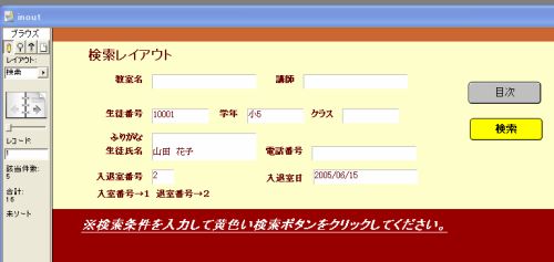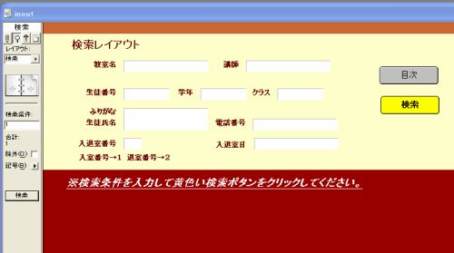 検索レイアウト画面では、入退室データから、検索条件を入力して特定の[生徒]のデータや[月日]のデータなどを抽出します。 抽出の方法は、生徒入退室管理目次画面の [検索]ボタンをクリックします。上図の検索の画面に替わりますので、検索の条件を入力欄に入力して、黄色の[検索]ボタンをクリックします。