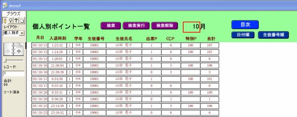 @[生徒入退室管理画面]の[個人ポイント一覧]のボタンをクリックすると、[個人別ポイント一覧]画面に変わり、入退室日、入退室時刻、学年、生徒番号、生徒氏名、出席ポイント、おみくじポイント、特別ポイント、合計ポイントを確認することができます。 A検索ボタンを押して、赤い枠に月番号(10月→10)と生徒番号欄に生徒番号を入力して、検索実行ボタンをクリックすると、生徒・月ごとのポイントの確認、印刷をすることができます。ポイントの合計は画面下のフッターに打ち出されます。