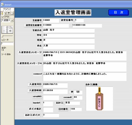■生徒入退室管理画面は、入退室管理ファイルのデータを確認する画面です。[inoutmessage.fp7]からルックアップされたデータを確認してください。