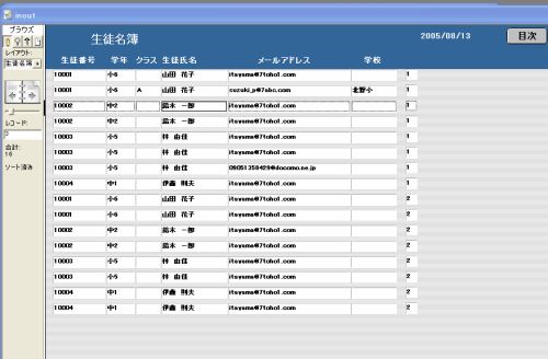 生徒番号、学年、クラス、生徒氏名、メールアドレス、学校、入退室番号の一覧画面です。