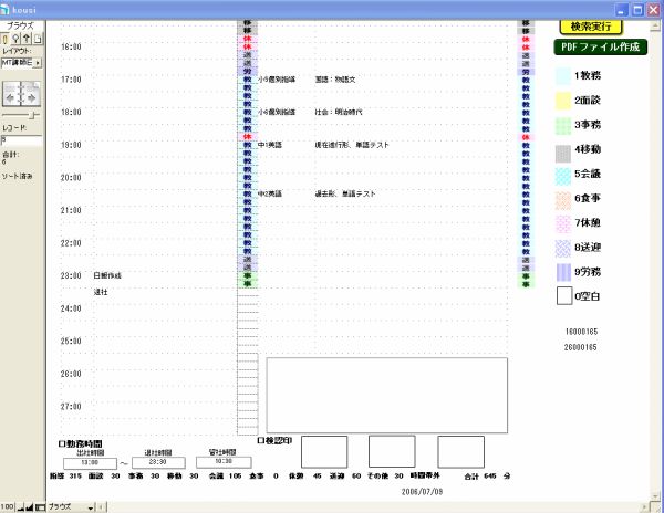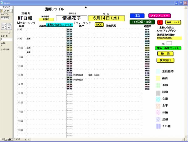 一日の業務の報告書を作成します。各時間帯ごとに、マネージング部門とティーチング部門に分けて、活動状況を入力します。日々の活動状況は業務ひながたファイルに前もって作成しておき、その日に業務ひながたファイルよりデータを取り込み、MT日報を完成させます。