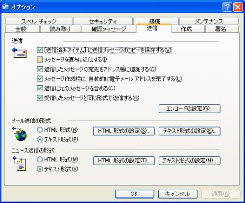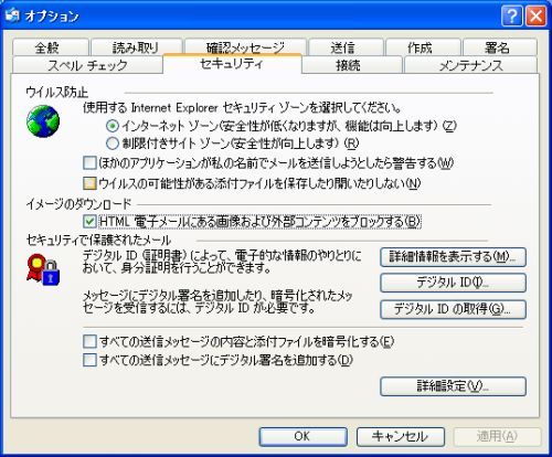 @メールソフトOutlook Express 6の設定を行います。メニューバーのツール→オプションで、オプションのダイアログボックスが表示されたら上図のように[□ほかのアプリケーションが私の名前でメールを送信しようとしたら警告する]のチェックを外してください。