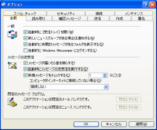 Aメニューバーの[ツール]→[オプション]を選択し、[全般]タブをクリックし、下図のように設定してください。[□新着メッセージをチェックする]のチェックを入れて、[1分ごと]にして下さい。そうすれば、会員証が読み取られた時にメールが一旦、[送信フォルダ]に送られますので、エラーの防止になり、連続で会員証を読み取ることができます。